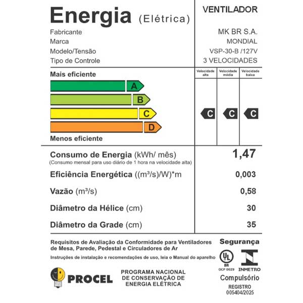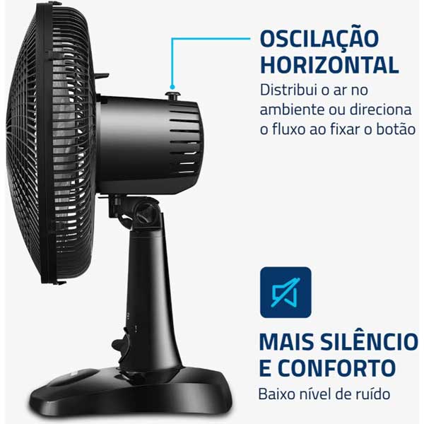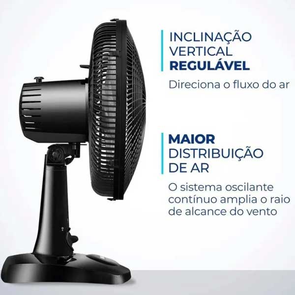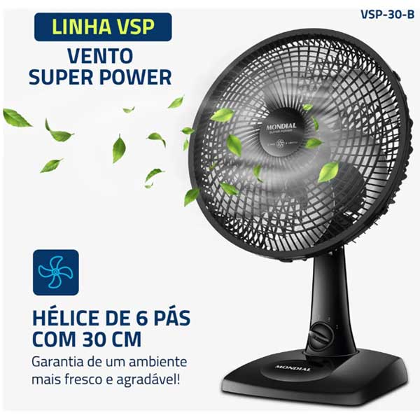 O ventilador Super Power VSP-30-B possui 30 cm de diâmetro e hélice com 6 pás, garantindo um ambiente mais refrescante e agradável. O Sistema Oscilante Contínuo amplia o raio do vento no ambiente e a Inclinação Vertical Regulável é perfeita para o direcionamento do fluxo de ar.